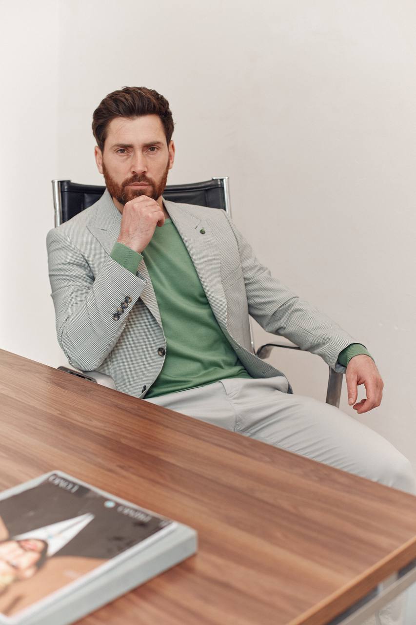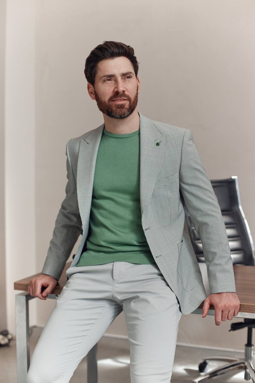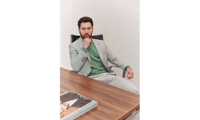 Піджак у біло-зелену клітинку + салатовий джемпер + сірі штани