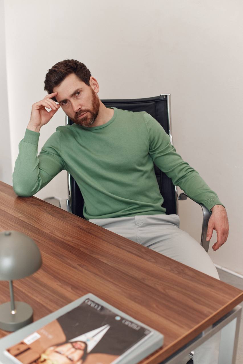 Тут ключовий акцент — на грі зелених відтінків. Салатовий джемпер освіжає та додає сучасності, а сірі штани “заземлюють” образ.